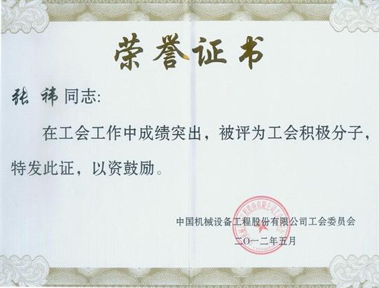 10月18日-19日,CMEC先進分工會和工會積極分子表彰大會暨經(jīng)驗交流會在京舉行。我司員工張亮、張祎兩位同志在工會工作中成績突出,被評為工會積極分子稱號。