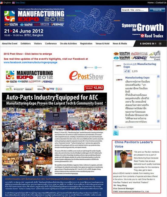 此次,我司副總經(jīng)理?xiàng)蠲飨壬苎麉⒓恿?012泰國(guó)國(guó)際機(jī)械制造展覽會(huì)開(kāi)幕儀式,并代表我公司及整個(gè)中國(guó)展團(tuán)受到了該展會(huì)官方采訪。在采訪中楊總說(shuō):“我公司及整個(gè)中國(guó)展團(tuán)很高興參加到勵(lì)展展覽集團(tuán)為我們組織的這次高質(zhì)量的國(guó)際商務(wù)合作機(jī)會(huì)中,我們將通過(guò)與新客戶的交流進(jìn)一步了解東盟市場(chǎng)。歡迎并邀請(qǐng)各位到塑料館和模具館參觀中國(guó)展區(qū)。”