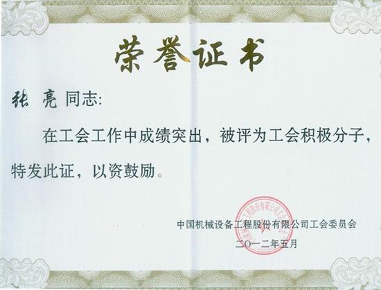 10月18日-19日,CMEC先進分工會和工會積極分子表彰大會暨經(jīng)驗交流會在京舉行。我司員工張亮、張祎兩位同志在工會工作中成績突出,被評為工會積極分子稱號。